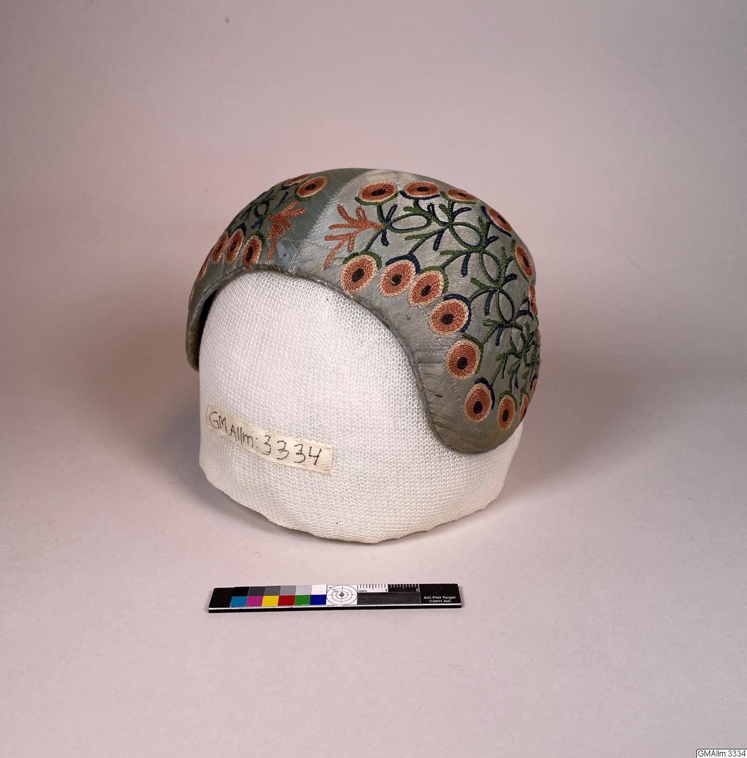 Broderiet på denna bindmössa är lika eller mycket snarlikt det på bindmössan GMallm:9813 färgställningarna skiljer sig dock åt.