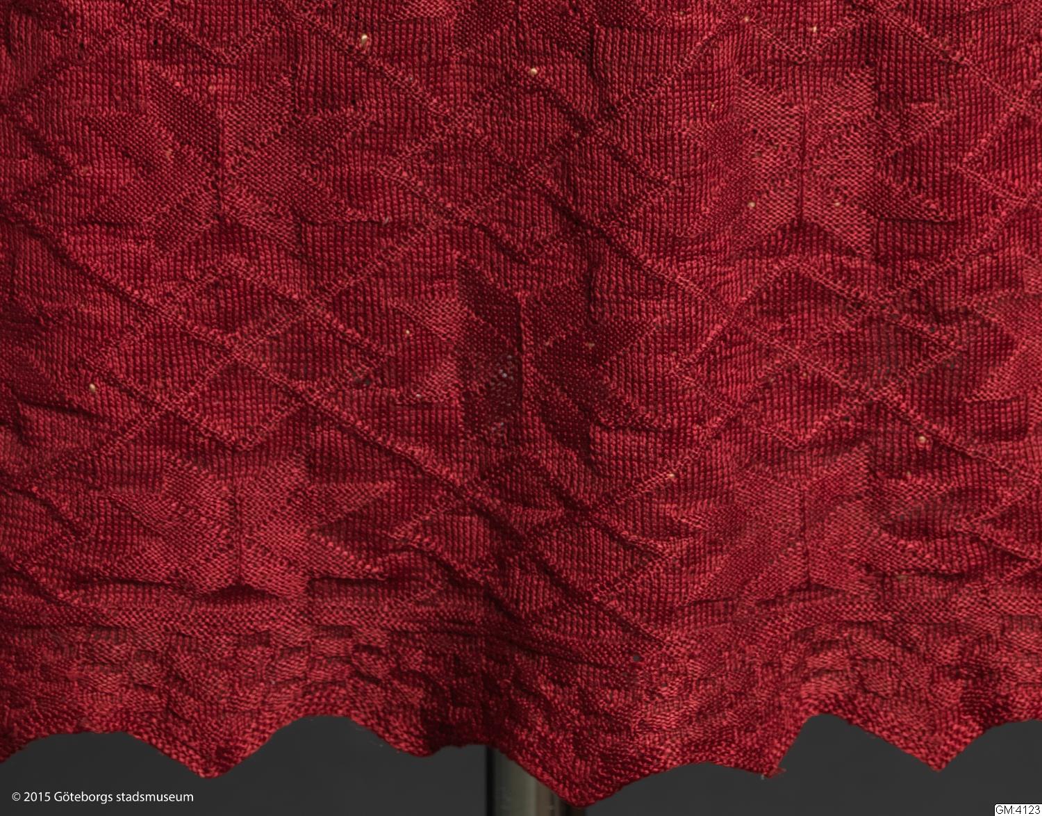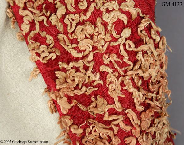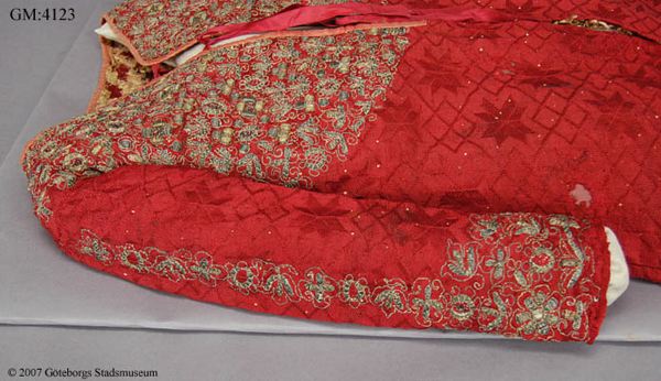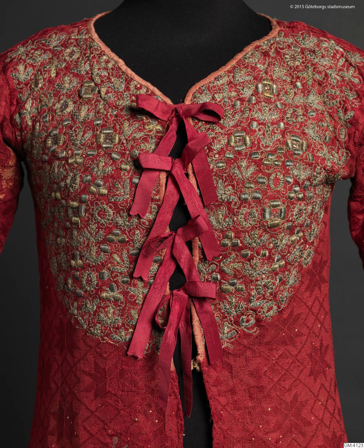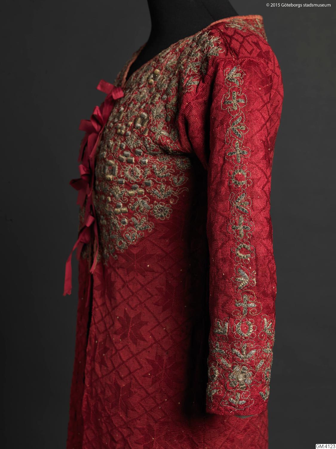 Plagget står upptagen i bouppteckning efter C. L. Widell 1827, i ett avsnitt rörande enskild egendom Widells hustru A. C. Roluffs fått genom testamente av den 21 aug. 1810 av fröknarna Maria och Anna Margareta Kampf. Dessa var systrar; däribland ett trähus med tillhörande plantage på stadens grund i 12:e roten under Nr 109 belägit", till ett värde av 1000:- Under gångkläder står "1 röd Silkes Koft, cordierad med Silfwer", upptagen till ett värde av -.32.-