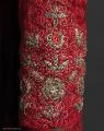 - Kofta stickad av rött tunt silkegarn, tillverkad under 1600-talet. Mönsterstickad med räta och aviga maskor i ett mönster med åttbladiga stjärnor inom ett diagonalt rutgaller. Vid ärmsluten och nederkanten en bård av fyrkanter, nederkanten har dessutom uddar. På insidan sitter sitter nockor liknande en ryalugg, troligen ska de öka plaggets förmåga att värma. Halsöppningen och en bit ned längs mittöppningen är kantad med siden. Knytbanden framtill är mycket hela för att vara samtida med plagget i övrigt, så de kan vara senare. Dessutom har koftan broderats med metalltråd i stiliserade växtmönster vid ärmsluten längs nacken och på bröstet. Delar av metallbroderiet är gjort över stoppning för att ge en relieff effekt. Observera sömmarna på framstyckena som skarvar materialet tvärs igenom broderiet längs en tänkt V-ringning. Det ser ut som någon vid ett tillfälle tänkt sy om koftan och ge den en större ringning men sedan ångrat sig och sytt fast delarna igen.