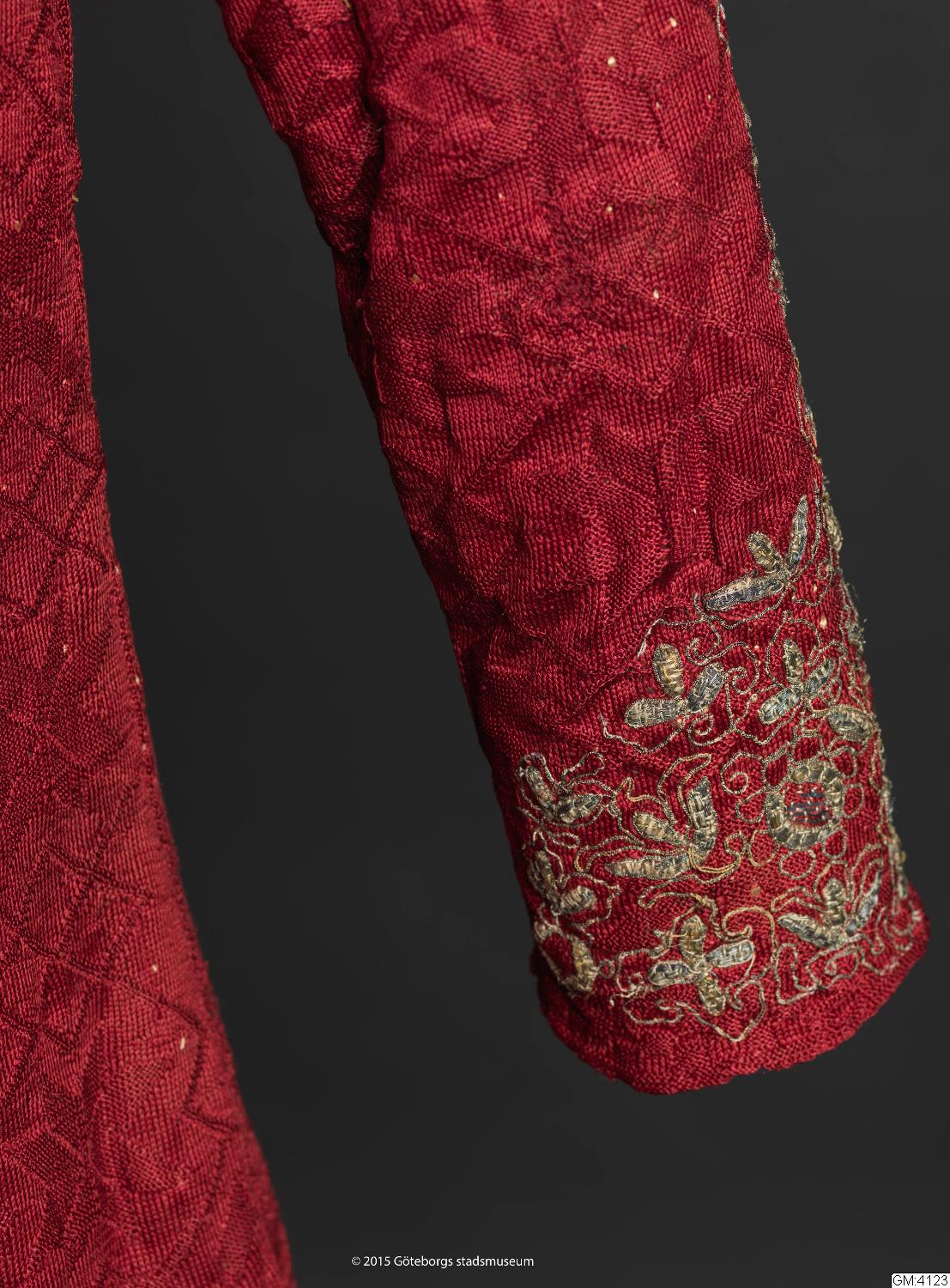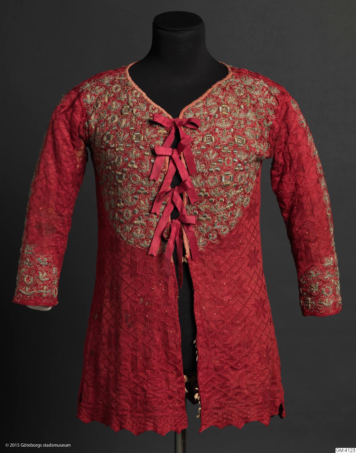 - "Fruntimmerskofta, stickad af rödt silke m. guld o silfver broderier."
