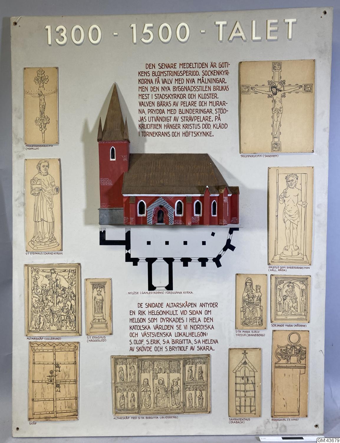 Utställningstavla med teckningar av krykliga medeltida föremål bildhuggeriarbeten, skåp och sakramentshus samt en halvmodell av Nylöse kyrka. Till teckningarna och modellen finns utställningstexter. Vilken utställning tavlan skapades för är f.n. ej undersökt.