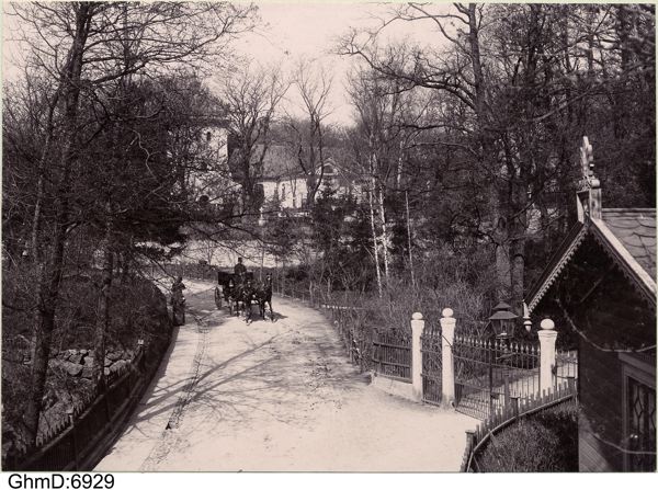 Danska vägen. Uppfarten över Delsjöbäcken till Örgryte gamla kyrka, T.h. grindarna till Jakobsdal.