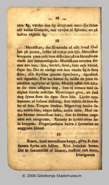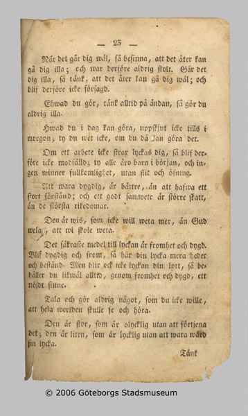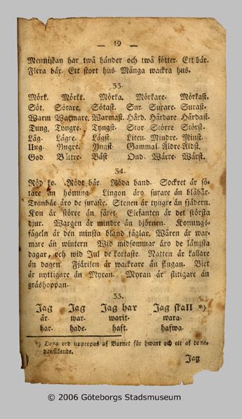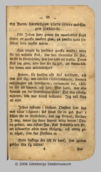 - består av ABC-del med bilder av J. Gillberg samt bokstäverna i fraktur och antikva, "bokstäfwernes indelning", stavningstabeller, längre texter att läsa ("Det lydiga barnet", Ett barn, hjerteligen rördt öfwer undfågnen förlåtelse"..mm); "Några underrättelser om Naturen, menniskan och konstens arter"; "Samling af Skriftens språk, till bewis af Christendomens wigtigaste stycken och lärdomar"; "kort sammandrag af Christendoms-kunskapen" samt info om mynt och kronologi mm (1 sid).