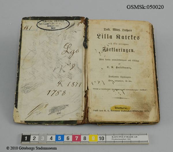 Hultkrantz katekes, 30 upplagan, tryckt 1873. Frakturstil. Med snörtamp fäst i bokryggen, som troligtvis använts som bokmärke.
