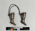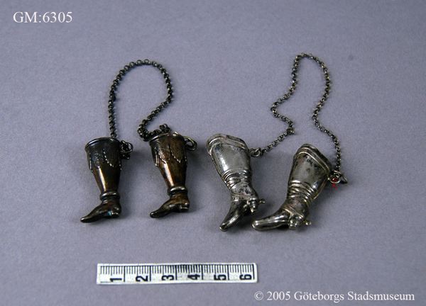 - Eleganta stickskyddare i form av ett par ridstövlar med en kedja emellan. Stövlarna är av tunn formpressad metallplåt, möjligen silver stämplar saknas. Kejan består av runda länkar formade av tunna platta metallband. Stickskyddare är ett sybehör avsett att träs över ändarna på strumpstickorna, stickningen kan då inte glida av stickorna och risken att någon eller något skadas mot de vassa spetsarna minskar.