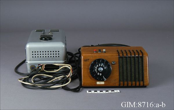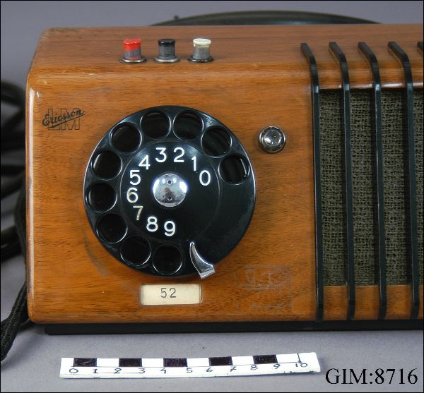 - Högtalar telefon som i original består av tre separata delar (här finns enbart två av dem). En telefonenhet av trä med lur, nummer skiva och mikrofon, en förstärkare av plåt och en högtalare (hötalaren saknas). Uppdelandet av hötalare och mikrofon har sin grund i problematiken med rundgång. Delarna är samankoplade av sladdar.