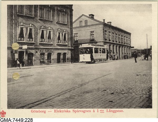 - Parti av Första Långgatan sett mot öster. Från vänster nr 27 (Stadens 11 rote, nr 65-71) och 25 (Stdens 11 rote, nr 64). Vykort med fotografi som förlaga, troligen från sekelskiftet 1900.