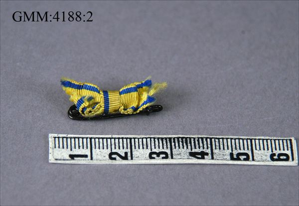 - bandrosett, vilken markerar innehav av riddarevärdighet av Kungl Svärdsorden, bäres på ex kavajuppslaget.