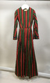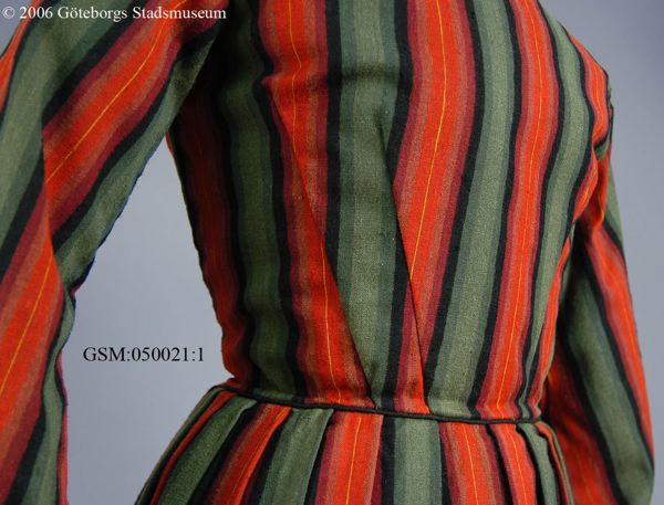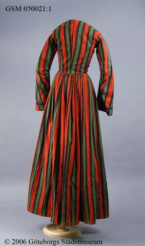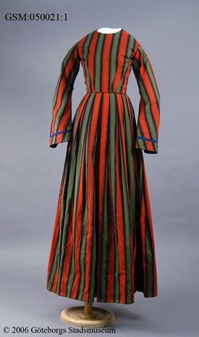 av sk köpetyg, helt handsydd. Livet är fodrat och klänningen är hellång. Ärmarna är av trumpetmodell. Midjan är mycket smal.