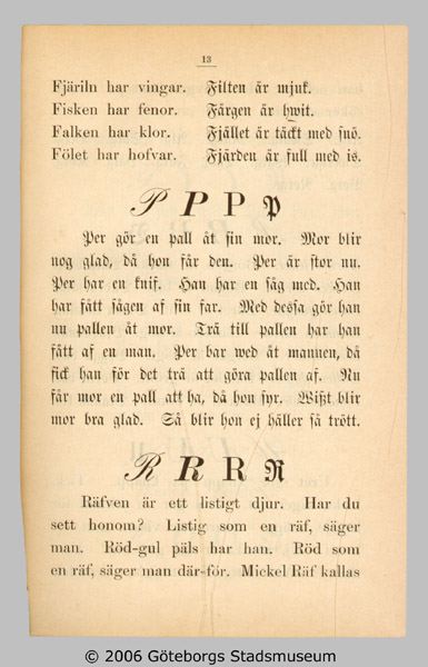 Per gör en pall åt sin mor. Mor blir nog glad, då hon får den. Per är stor nu. Per har en knif. Han har en såg med. Han har fått sågen af sin far. Med dessa gör han nu pallen åt mor. Trä till pallen har han fått af en man. Per bar wed åt mannen, då fick han för det trä att göra pallen af. Nu får mor en pall att ha, då hon syr. Wisst blir mor bra glad. Så blir hon ej häller så trött.
