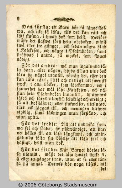 Den första: Ett Barn bör så länge stafwa, och icke få läsa, tils det kan rätt och lätt stafwa, i hwad bok som helst. Derföre måste det stafwa först hela abcboken, minst twå eller tre gångor, och sedan några blad i Katekesen, och några i Psalmboken, samt pröfwas i andra, så mycket, som finnes nödigt.
