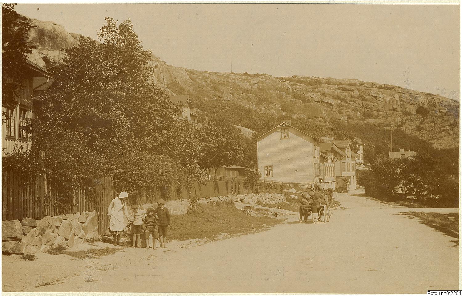 vagn; man; pojke; kvinna; häst; tunna; väg; träd; staket; mur; bostadshus; hus