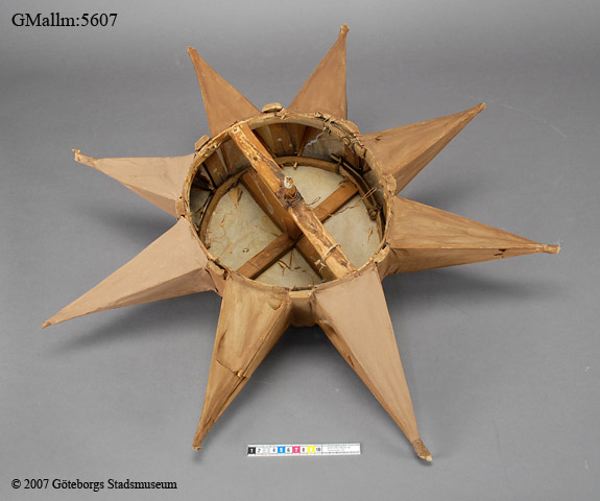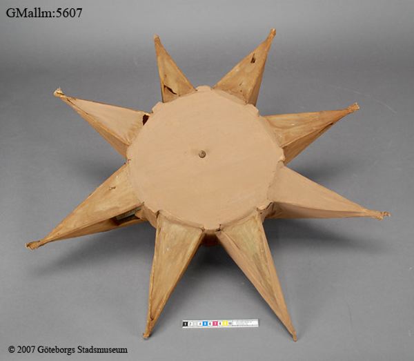 - Julstjärna, stomme av trä, klädd med papper. Köpt från Johan Skantze, Mollösund, Orusts västra härad, Morlanda socken.
