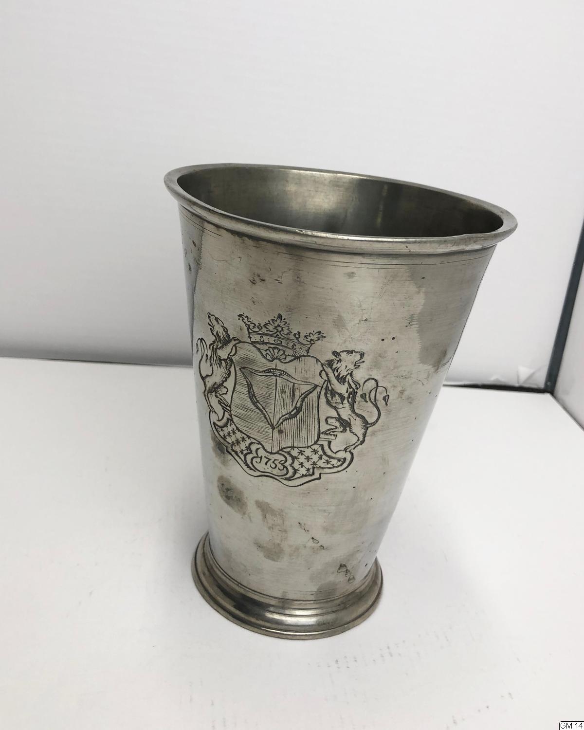 - "Bägare af tenn, årtal 1755. Linne- och Drällväfvare-Embetets i Göteborg. Gåva från herr W. Robertson."