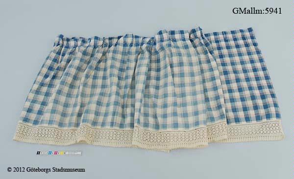 En kappa som är rynkad upptill och dekorerad med påsydd benvit spets nedtill. Bredd: 46 cm längd: 189cm.