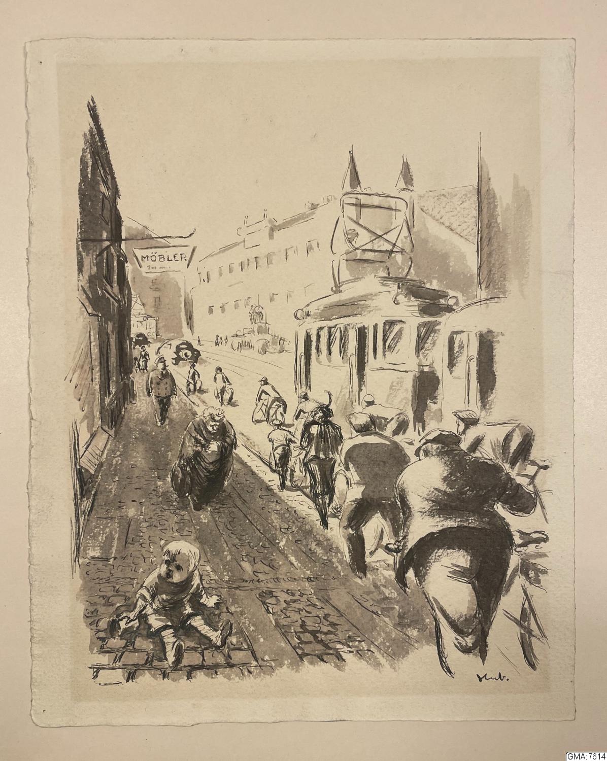laverad teckning, signerad "Hub" (= Hubert Lärn): från Stigbergsliden.