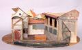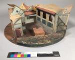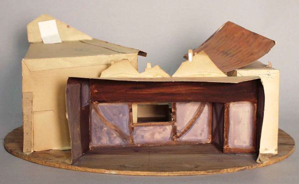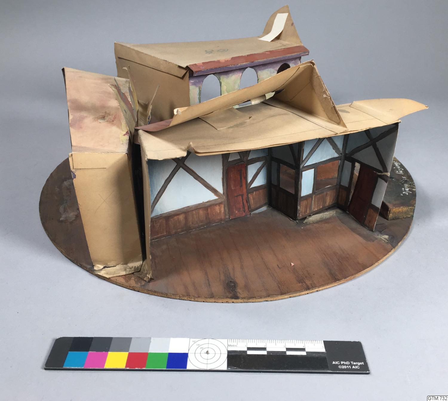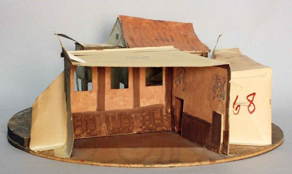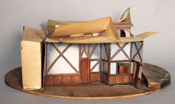 - Vridscenmodell med fyra scenbilder på cirkelrund grundplatta. _a: längst fram en platta med mönster som stenbeläggning, på vänster sida vinklad fasad av korsvirkehus med dörr och fönster, på höger sida husfasad i två våningar med rundbågade fönster på övervåningen och fönster med luckor på bottenvåningen, i bakgrunden flera husfasader. _b: interiören av högra huset i _a-bilden med tak och ljusa orange väggfält och bruna paneler, två dörrar på höger sida. _c: ljusa blå väggar med brunt korsvirke, mörkbrunt tak, fönster på mittväggen, brun dörr på var sida. _d: rum med ljusblå väggar och korsvirke, bruna paneler, dörr på mittväggen och på höger sida, fönster på den vinklade högra väggen, ljust tak.