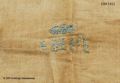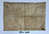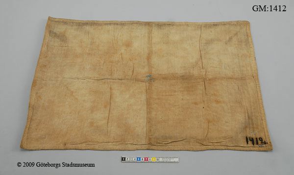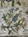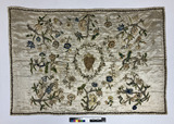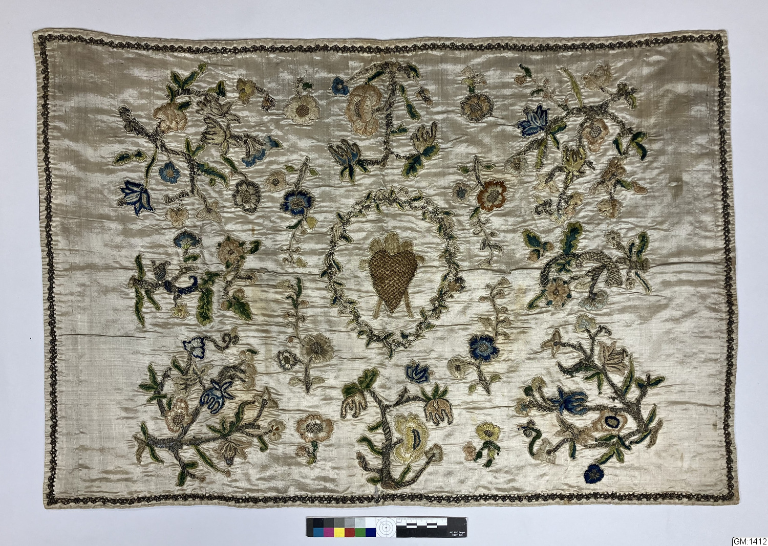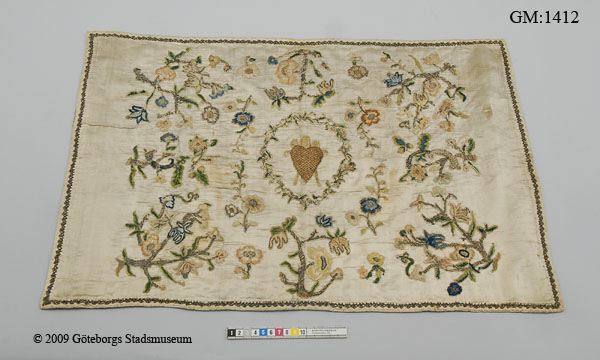 Kalkduk i gräddvitt sidensatin. Broderat blomstermotiv över hela kalkduken med silke och metalltråd. Central kristussymbol med hjärtat omgivet av en växtkrans. Samtliga broderier är kantade med langettsöm i ljust garn. Längs kanterna påsydd metallspets. Fodrad på baksidan med ofärgat linne. Mitt på baksidan är ett det broderat IHM med en kungakrona över (ca 3,5 x 2,5cm ) i ljusgrönt. /aa