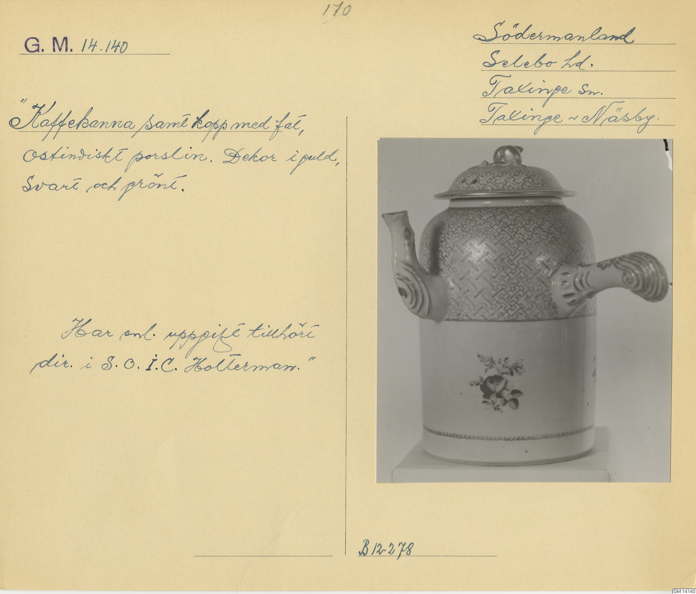 GM katalogkort 170. 18E. Porslin Ostindiskt 1. Thé mm 1. Kannor, koppar, fat