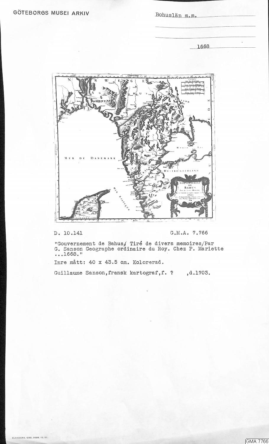 karta, kolorerad: " Gouvernement de Bohus. Tiré de divers memoires. Par G. Sanson Geographe ordinaire du Ray. Chez P.Marielle ...1668."
