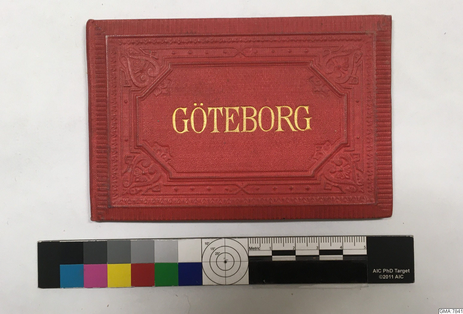 litografiskt tryck efter fotografier, sammanhängande svit om 9 göteborgsvyer. I omslag av rött pressat papp med "Göteborg" tryckt i guld. Utvikbar karta i färg: