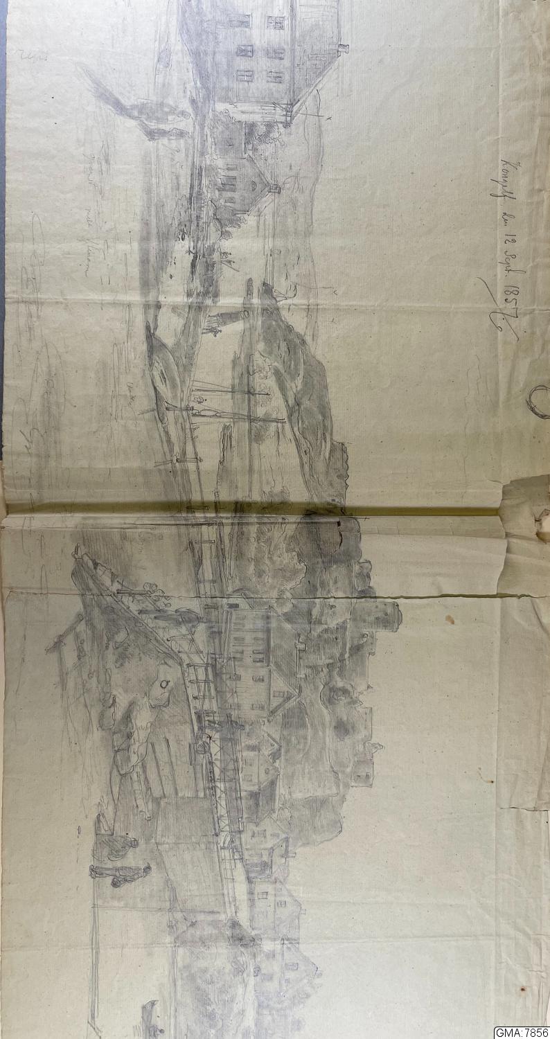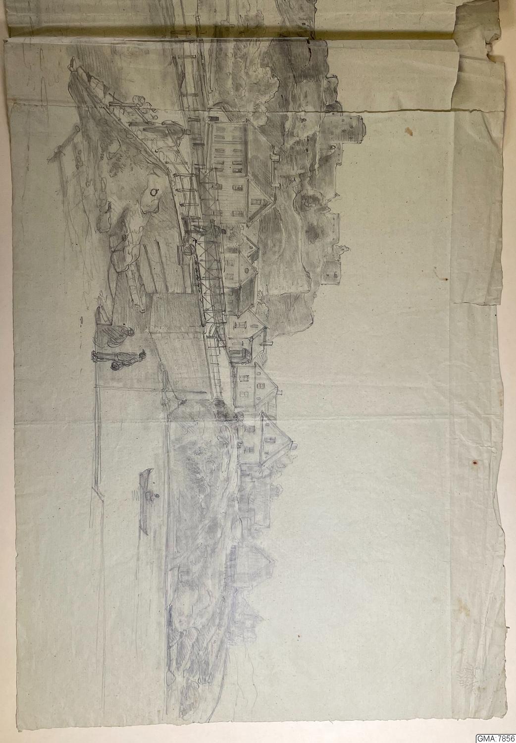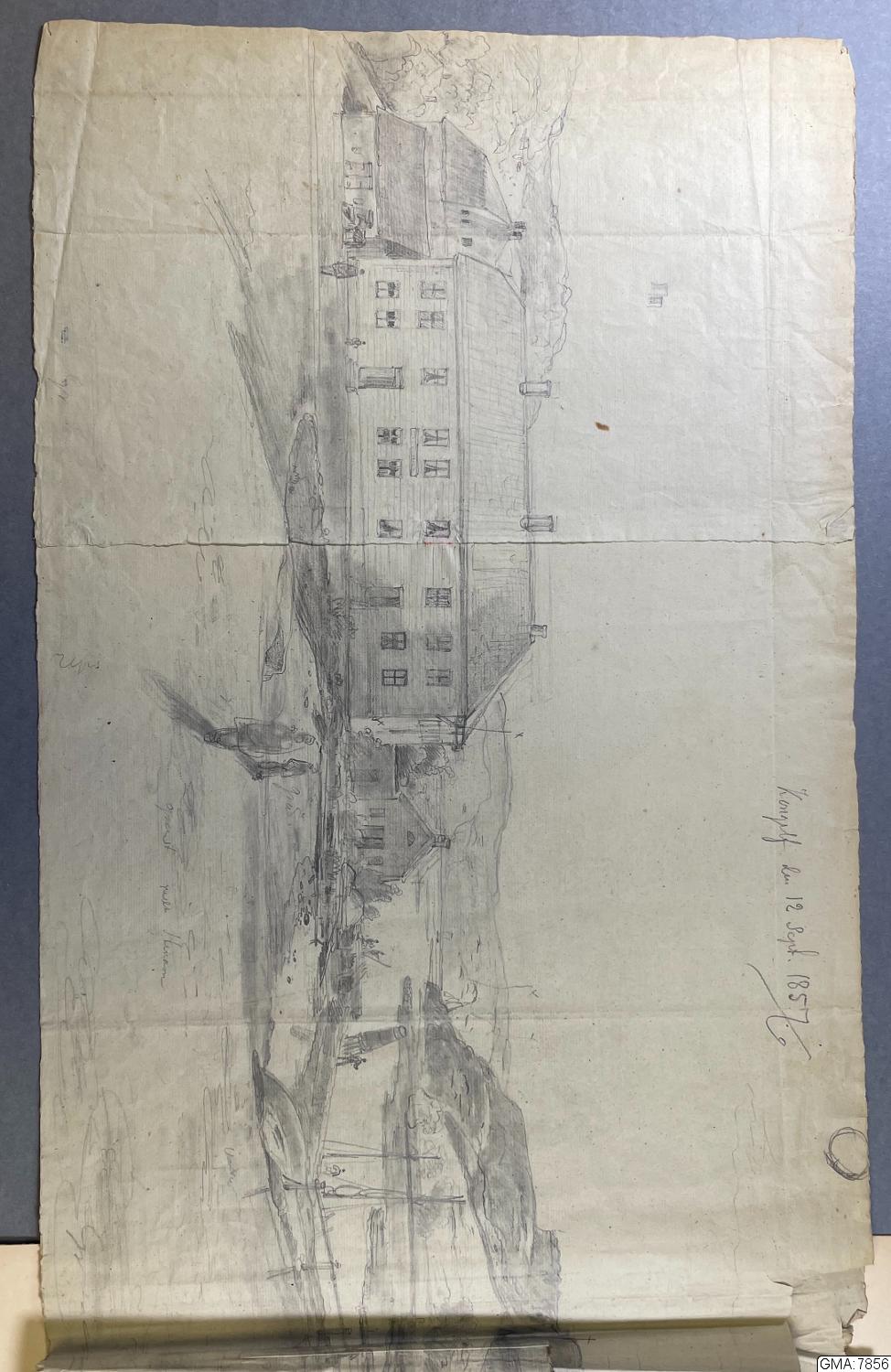 vy av Kungälv med Bohus fästningsruin. Blyertsteckning av Johan Christian Berger (1808-1871). Sign. " Kongelf den 12 sept. 1857." Ca 34,8 x 106 cm.