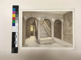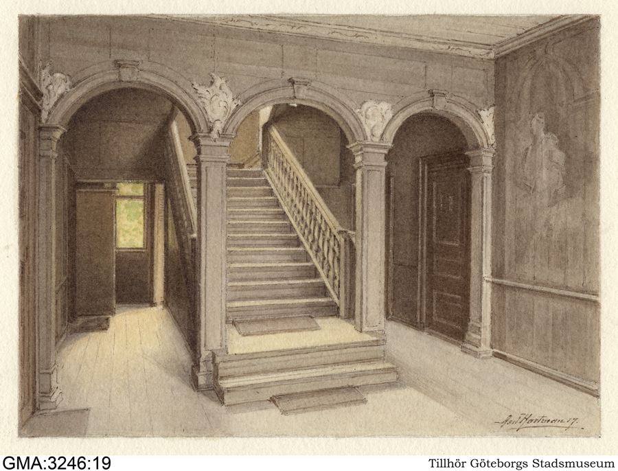 Gathenhielmska huset. Förstugan med trappan som leder till andra våningen.