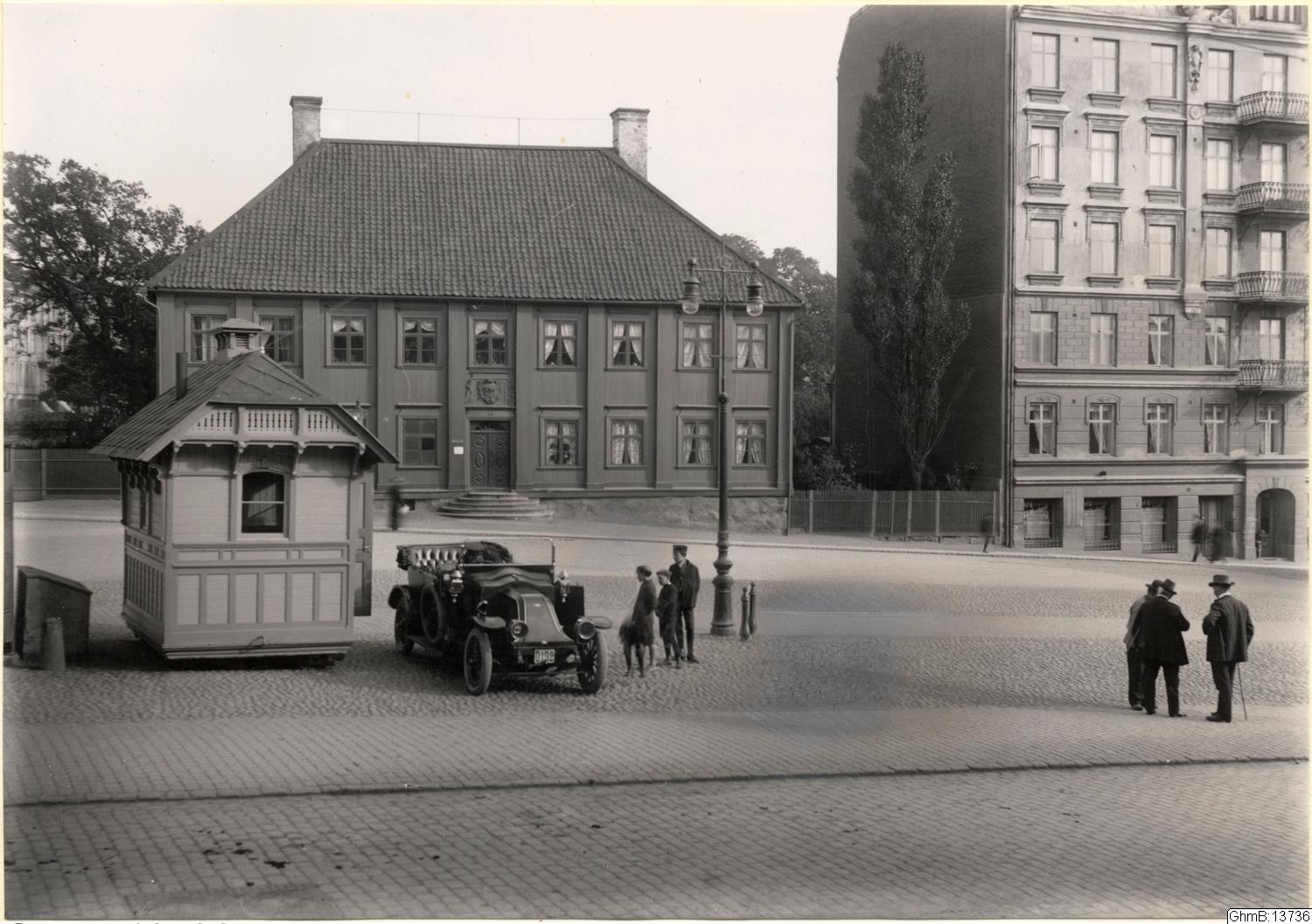 - Gathenhielmska huset och en del av "skandalhuset". Stenhuset till höger i bild med sina fem våningar, ansågs för störande i förhållande till Gathenhielmska huset. Huset revs 1938. På torget ligger en taxistation, eller som man sa droskstation.