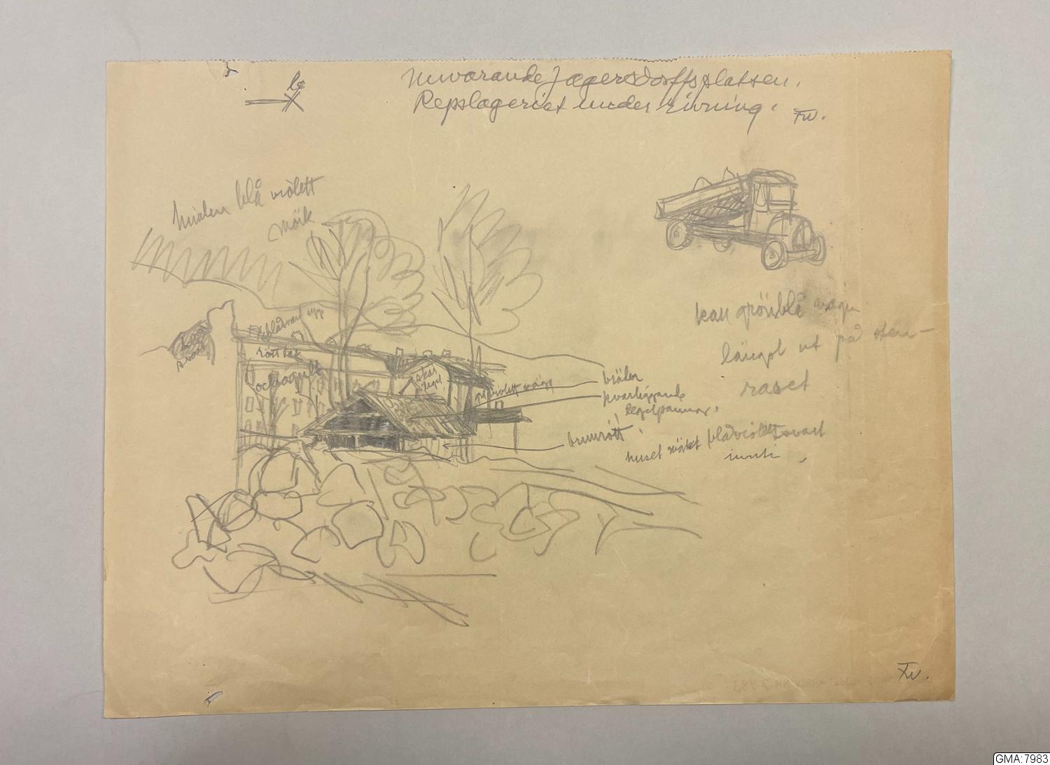 - "Nuvarande Jaegerdorffsplatsen. Repslageriet under rivning". (Konstnärens attribuering.) (Slottsskogsgatan.) Blyertsskiss med påskrivna uppgifter om färg, Sign. "FW" (Filip Wahlström).