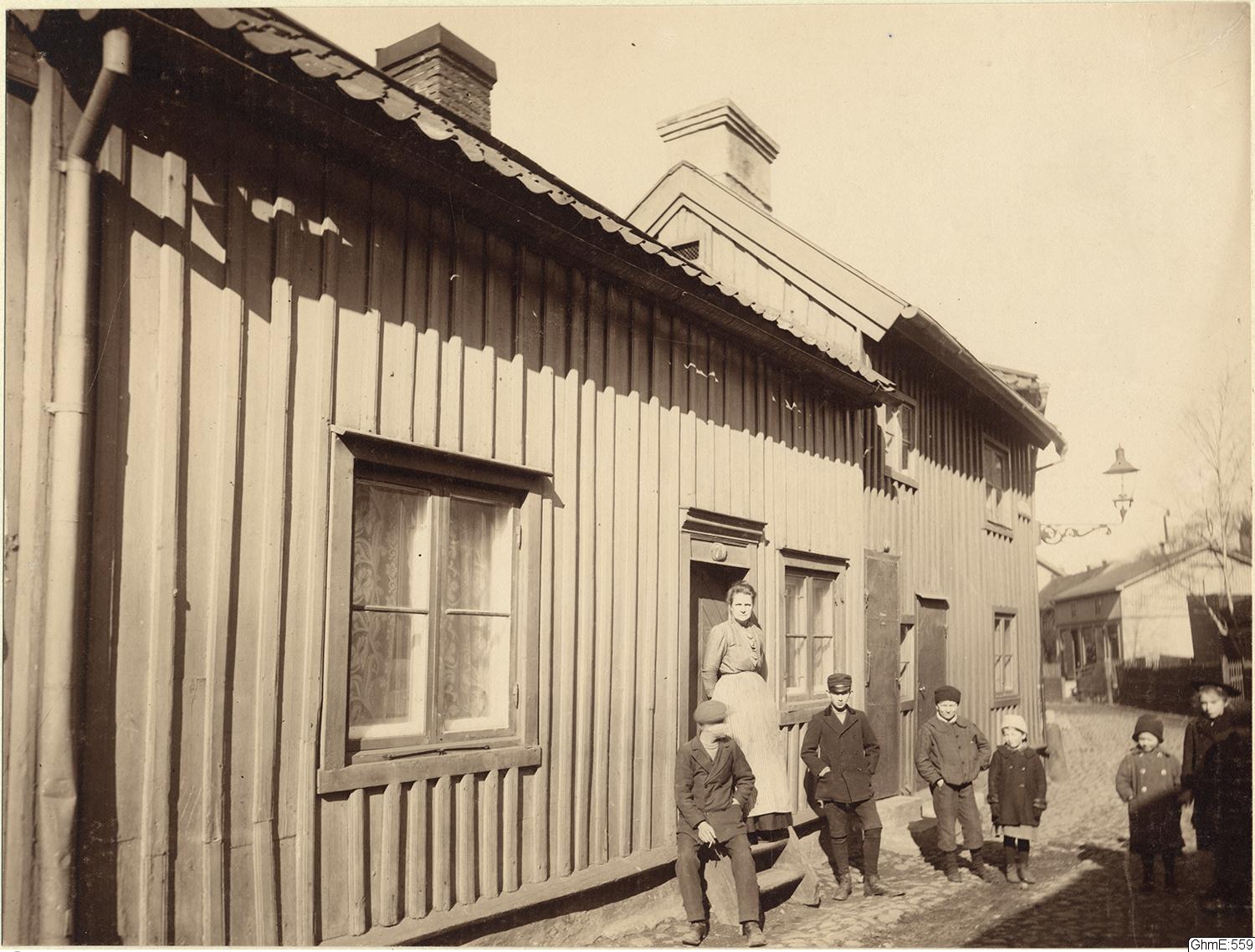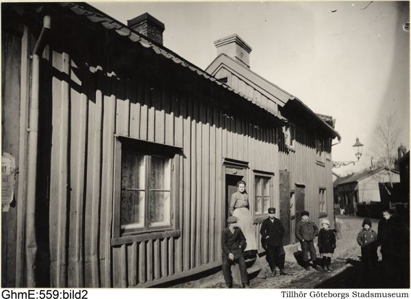 - Gröna gatan, från vänster nr 7 B och 7 A. huset kallas "Skåpet". Utanför huset har familjen som bor där ställt upp för fotografering.