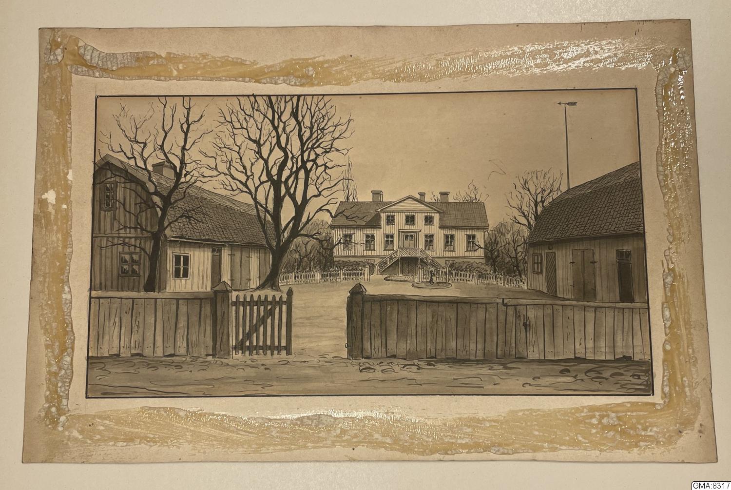 laverad tuschteckning (tuschlavyr), osignerad: egendomen Oljekvarn (Söderlingska huset med flyglar, kvarteret Gathenhjelm).