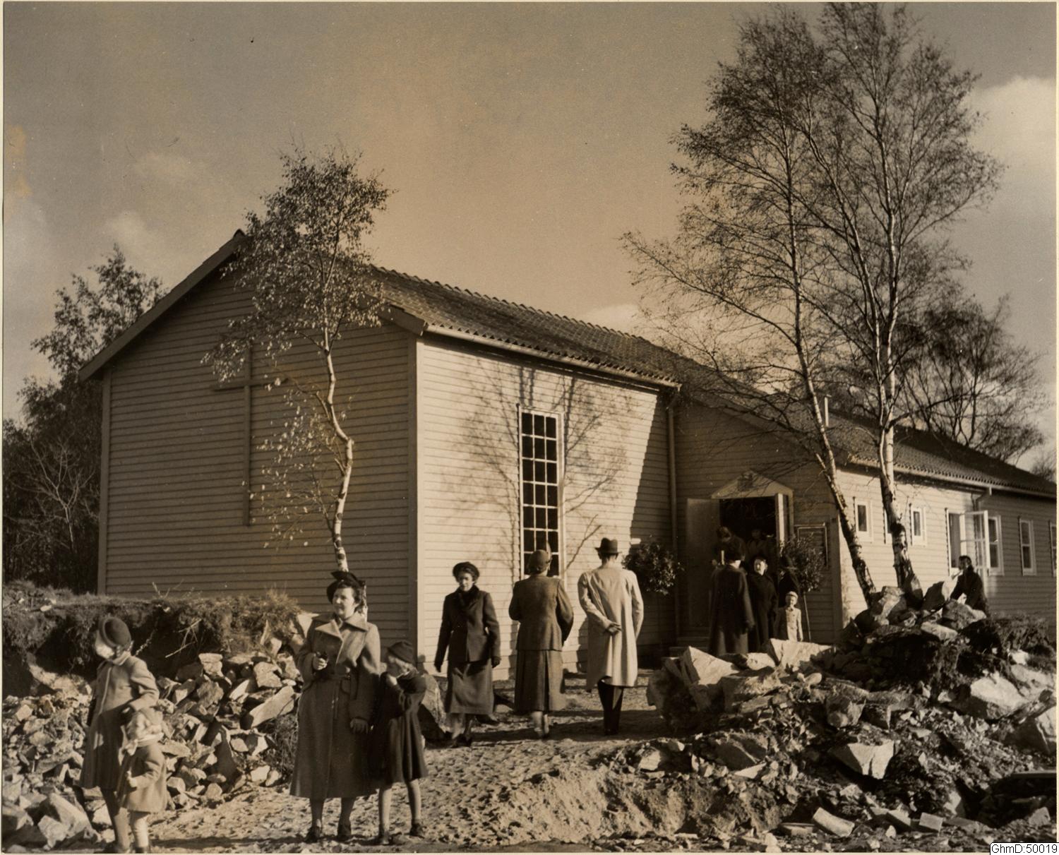 Guldhedskyrkan, även kallad barackkyrkan uppförd 1951. Byggnaden bestod av två sammanbyggda träbaracker som församlingen hade fått i gåva av krigsmakten 1949. Den ena var inredd till kyrkosal och den andra var samlingssal med tillhörande pentry.