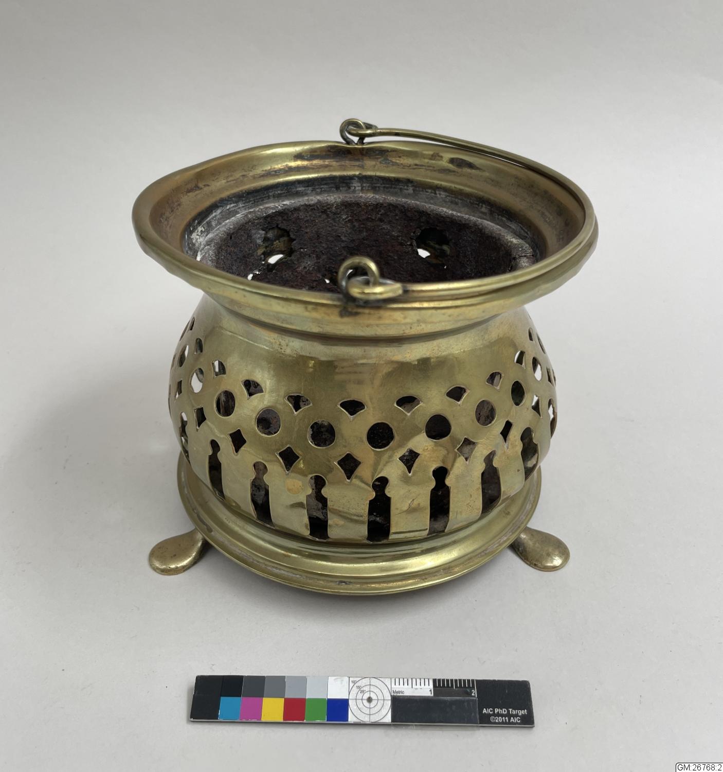 - av mässing med lös insats av järn. Brännaren perforerad. 3 fötter.