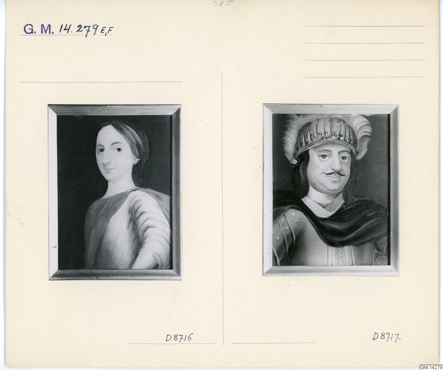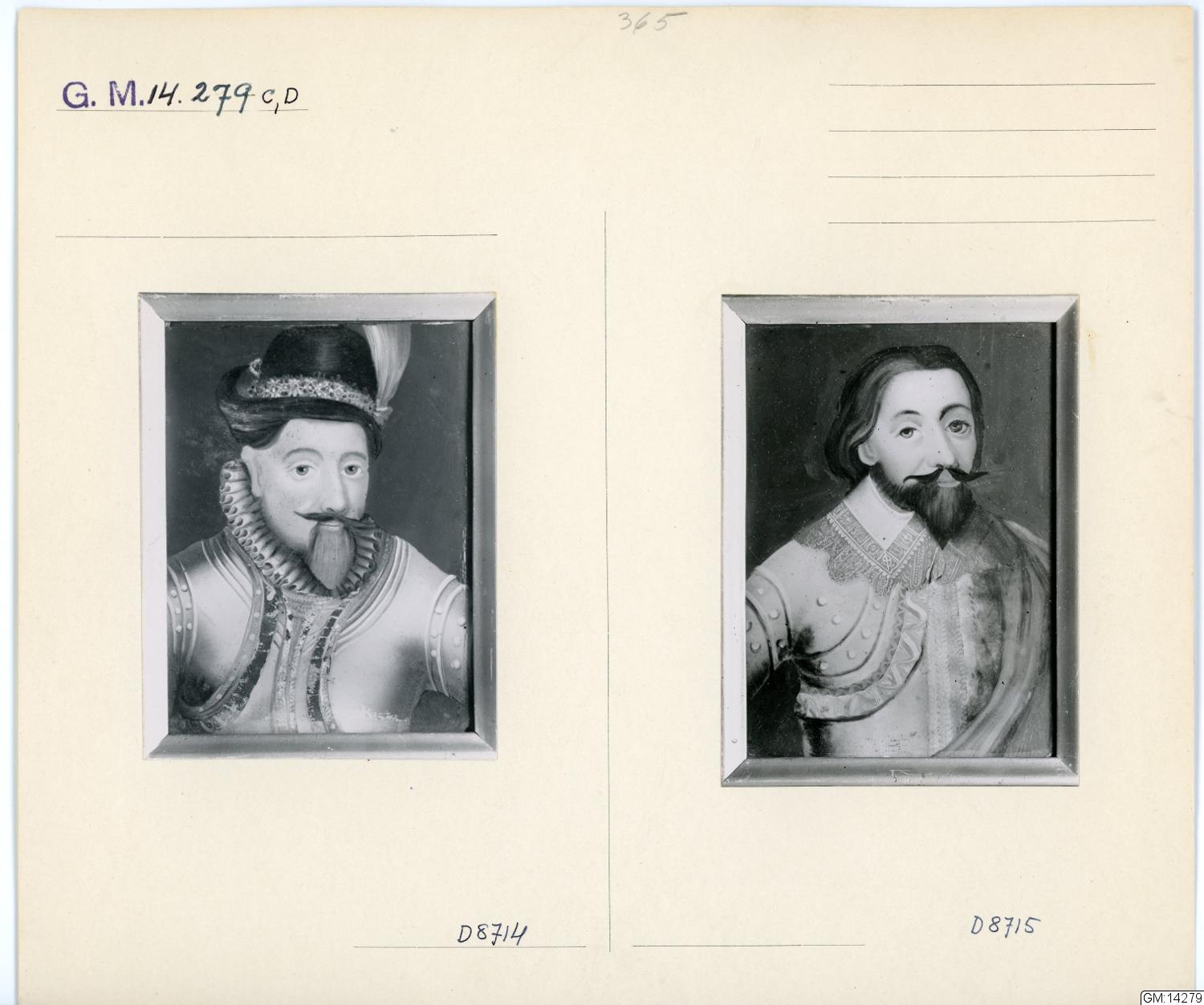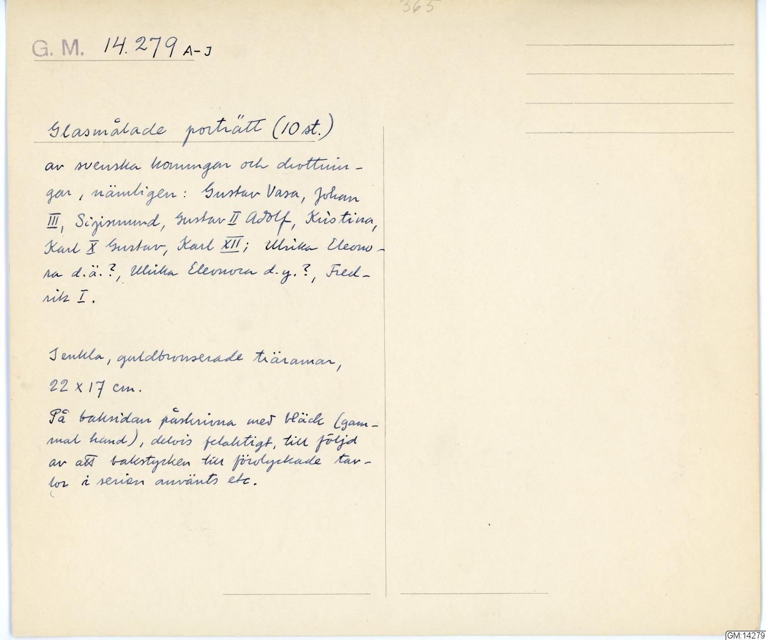 - Målade porträtt på glas (10 st.) föreställande svenska kungar och drottningar. Infällt mellan glas och bakstycken skymtas papper med påskrifter (till synes samtida med målningarna) se detaljbilder under delobjekt GM:14279:j.