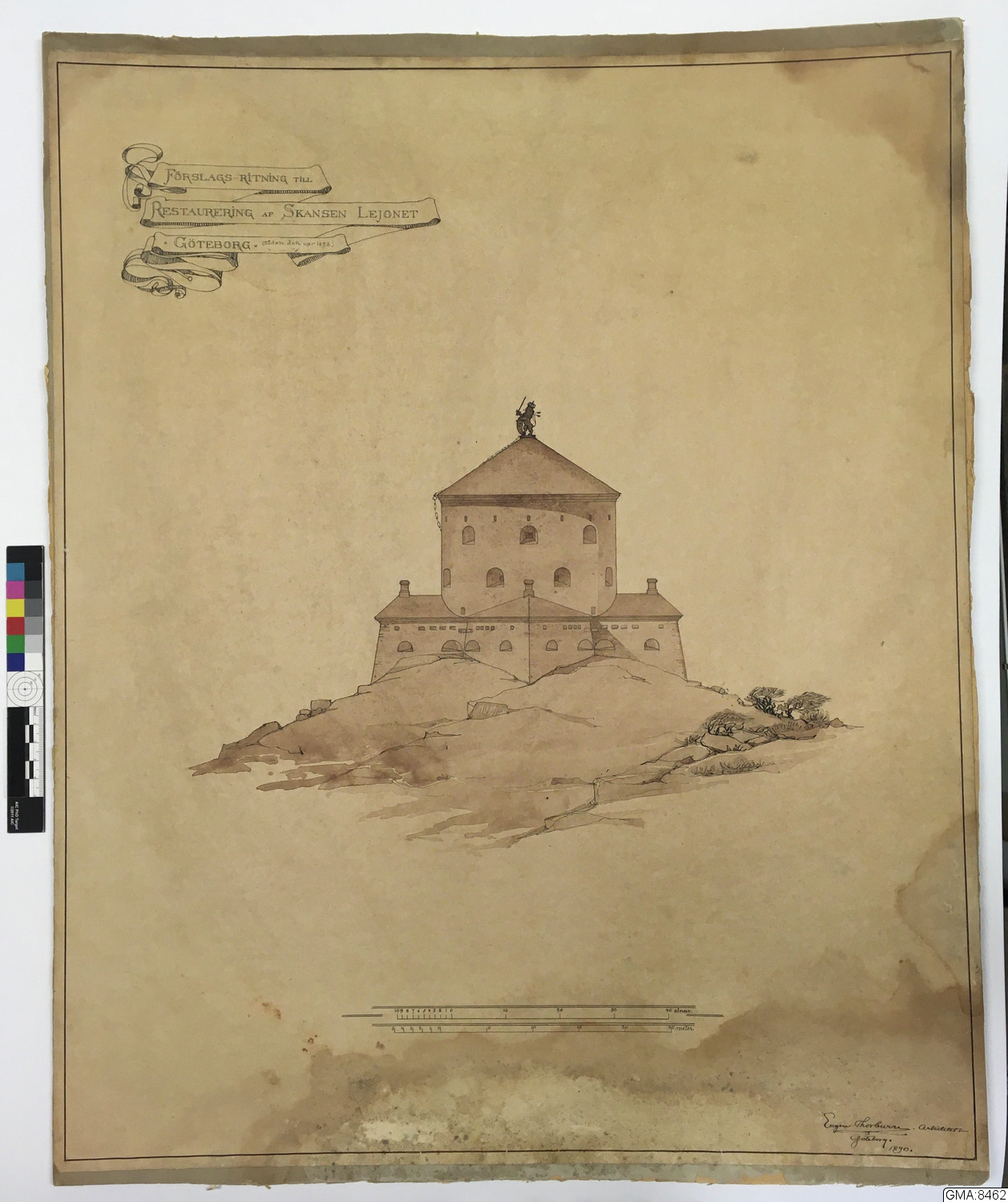 tuschritning med sepialavering: " Förslagsritning till resturering af skansen Lejonet, Göteborg (sådan den var 1692). Eugen Thorburn arkitekt Göteborg 1890." Inom tuschram: 60 x 49,1 cm.