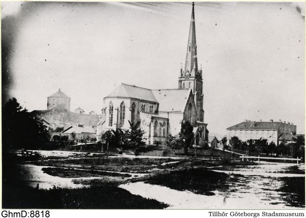 - Hagakyrkan, vy från n.n.o. Foto efter originalfoto med påskrift a tergo: "Göteborg/ Haga Kyrka och Skansen Kronan på 1860-talet" och som år 1949 äges av dir. S. Welin, Göteborgs Intecknings Garanti AB.