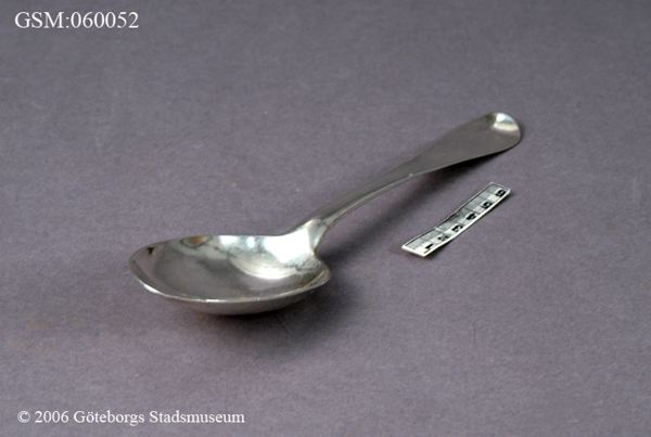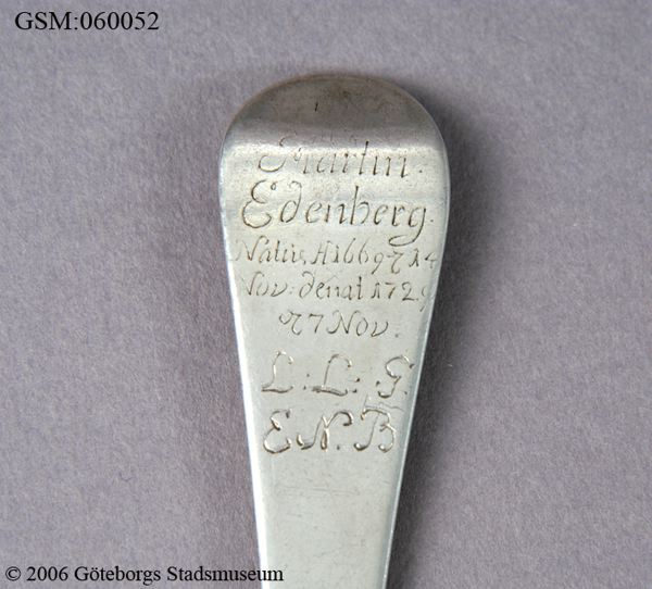 Enligt stämplingen på skeden är den tillverkad av Abraham Pedersson Wirgman (1706-1761) år 1727. Skeden är alltså tillverkad ett par år innan den kom till användning som begravningssked och försågs med minnesinskriptionen.