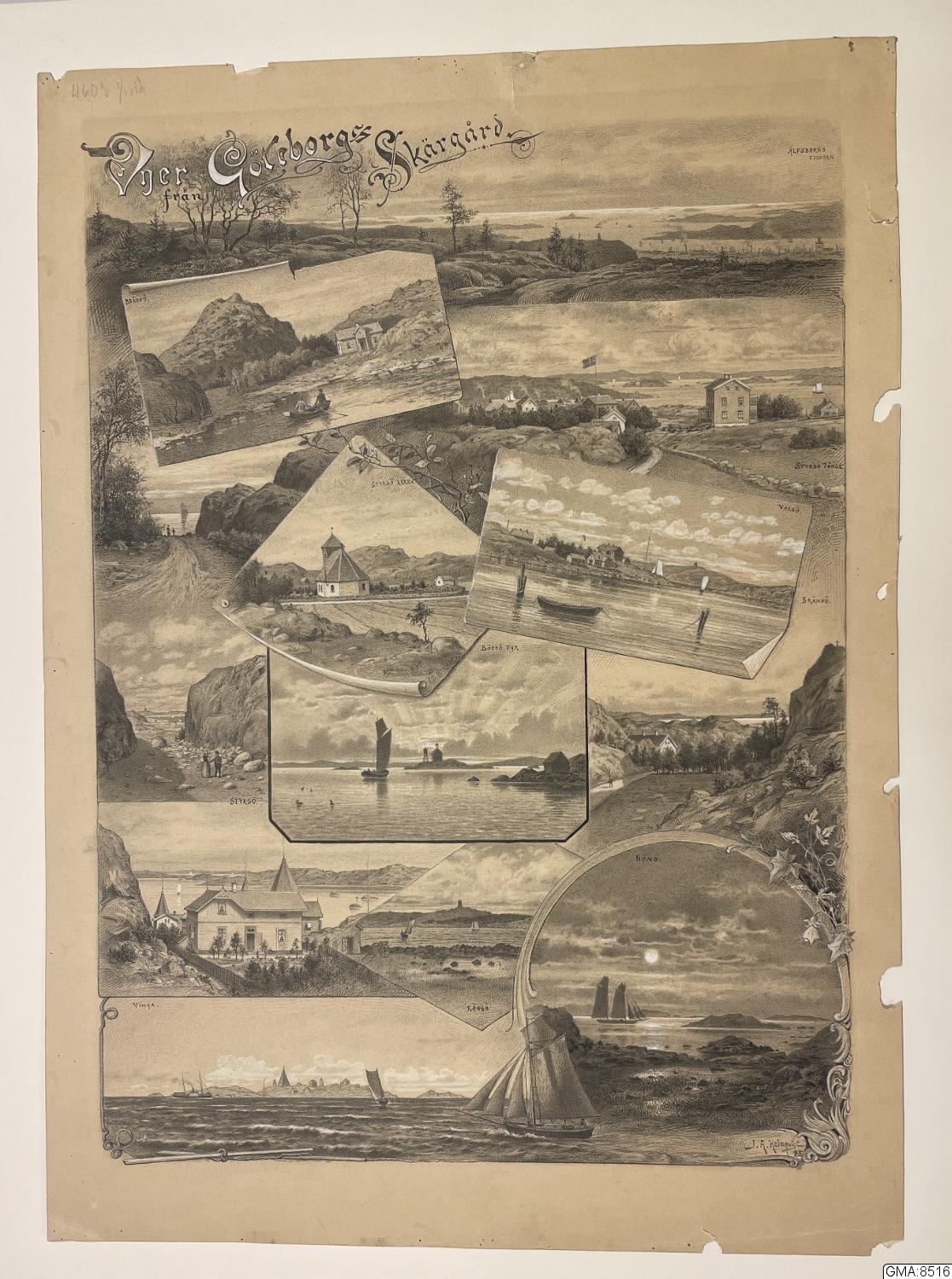 kolteckningar med förhöjning i vitt, mosaik å ett blad av J. A. Holmqvist, ca 52 x 37 cm,: "Vyer från Göteborgs Skärgård." (Repr. i "För Svenska hem", 1895, sid. 300.)