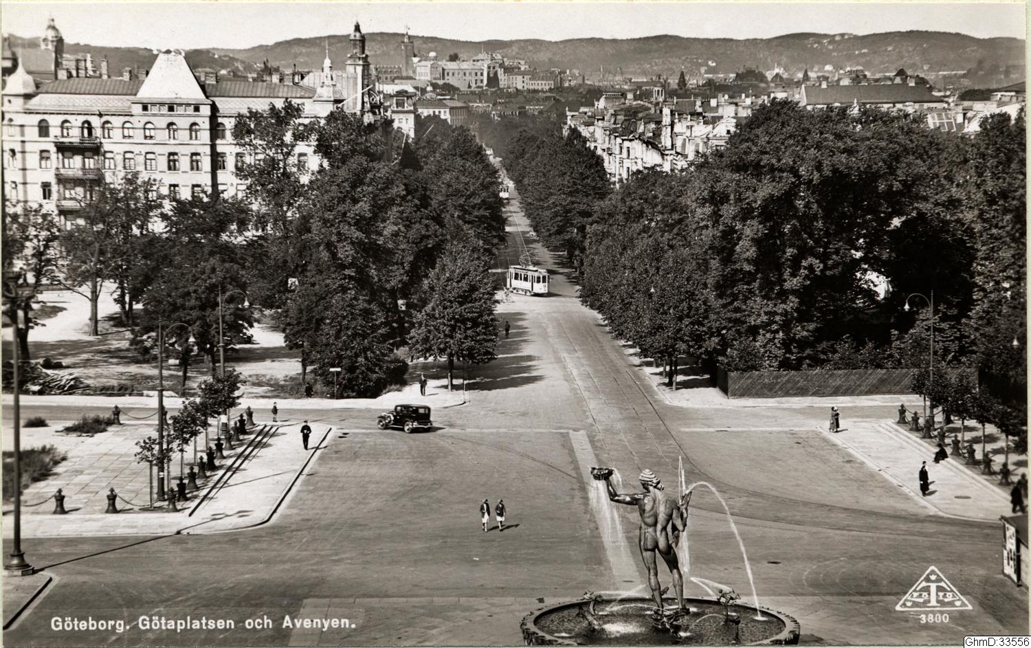 Utsikt från Konstmuseet mot norr, med Götaplatsen, Poseidon och Kungsportsavenyen. Till höger, norr om Berzeliigatan Lorensbergsparken. I fonden nordstaden med Kvarnberget och Hisingen.