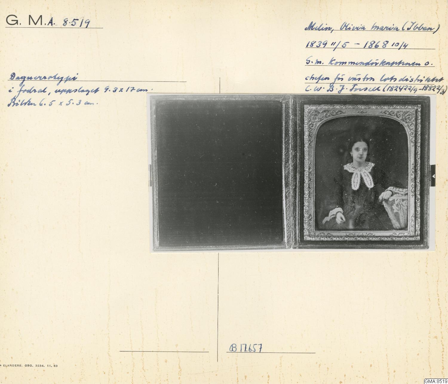 daguerrotypi, porträtt av Olivia Maria (Ibban) Forsell, f. Melin (11/5 1839-10/4 1868). Gift med C. W. B. J. Forsell, kommendörkapten, chef för västra lotsdistriktet (22/9 1824-2/3 1882). - I skinnklätt etui.