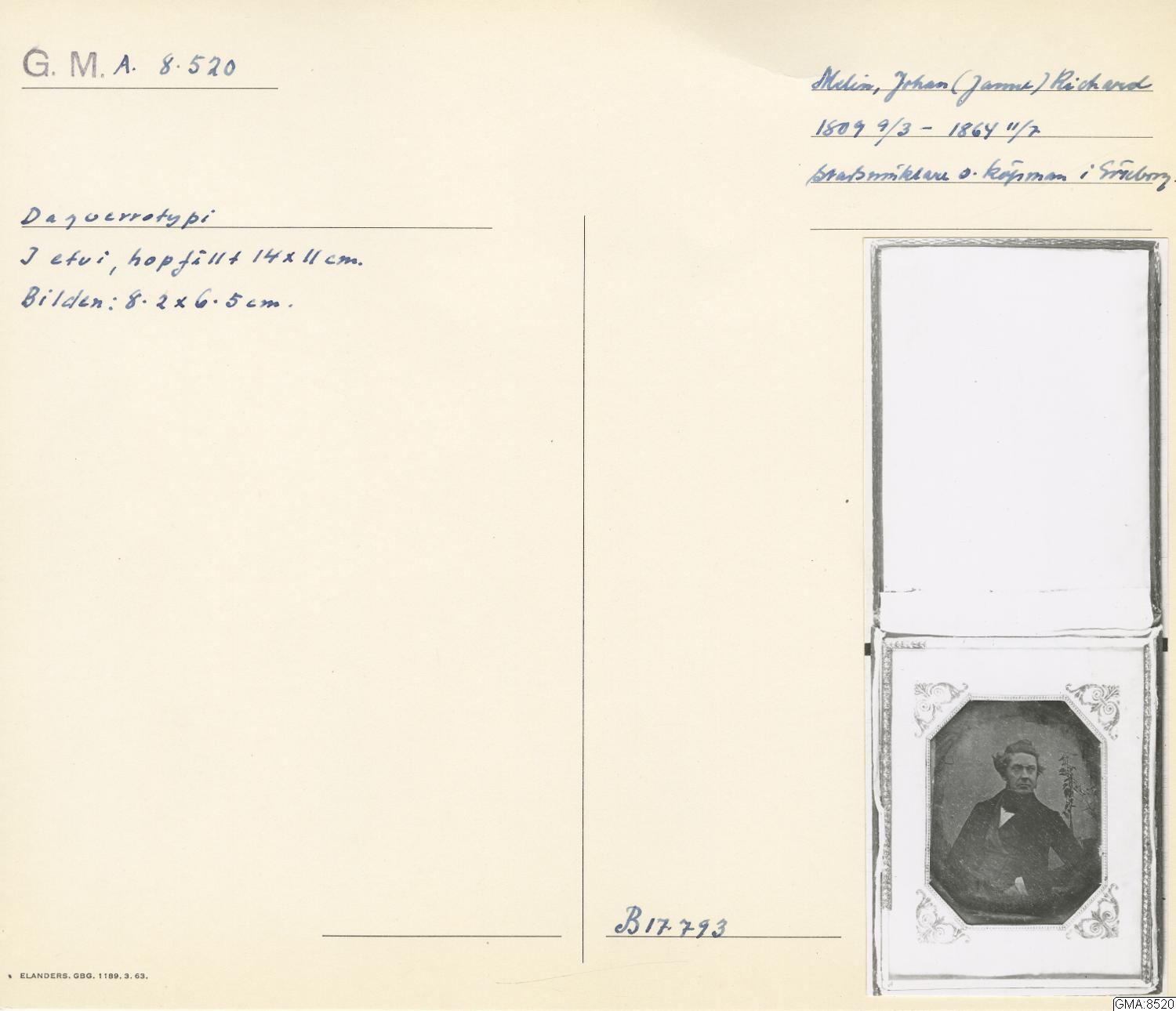 daguerrotypi, porträtt av Johan (Janne) Richard Melin (9/3 1809-11/7 1864). Stadsmäklare och köpman i Göteborg. - I etui av imiterat skinn.