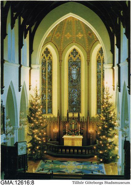 Vykort, tryckt i färg, med färgfotografi som förlaga. Julkort - interiörbild från Hagakyrkan i adventtid, 1970-talet.