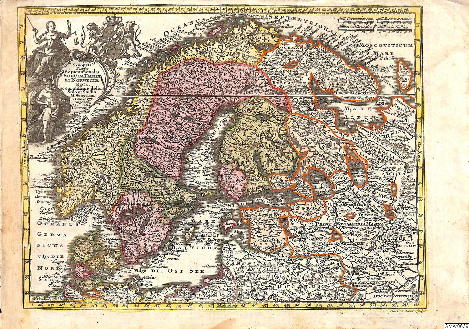 - karta, kolorerat kopparstick: Synopsis plagae septentrionalis Sueciae, Danice et Norwegice regn...M. Sentteri S. C. M. Geogr. hug. Vind. C. Pru S. R. J. Vicariat. - Tob. Conr. Lotter, scups. A. t. div. anteckningar med bläck på italienska.