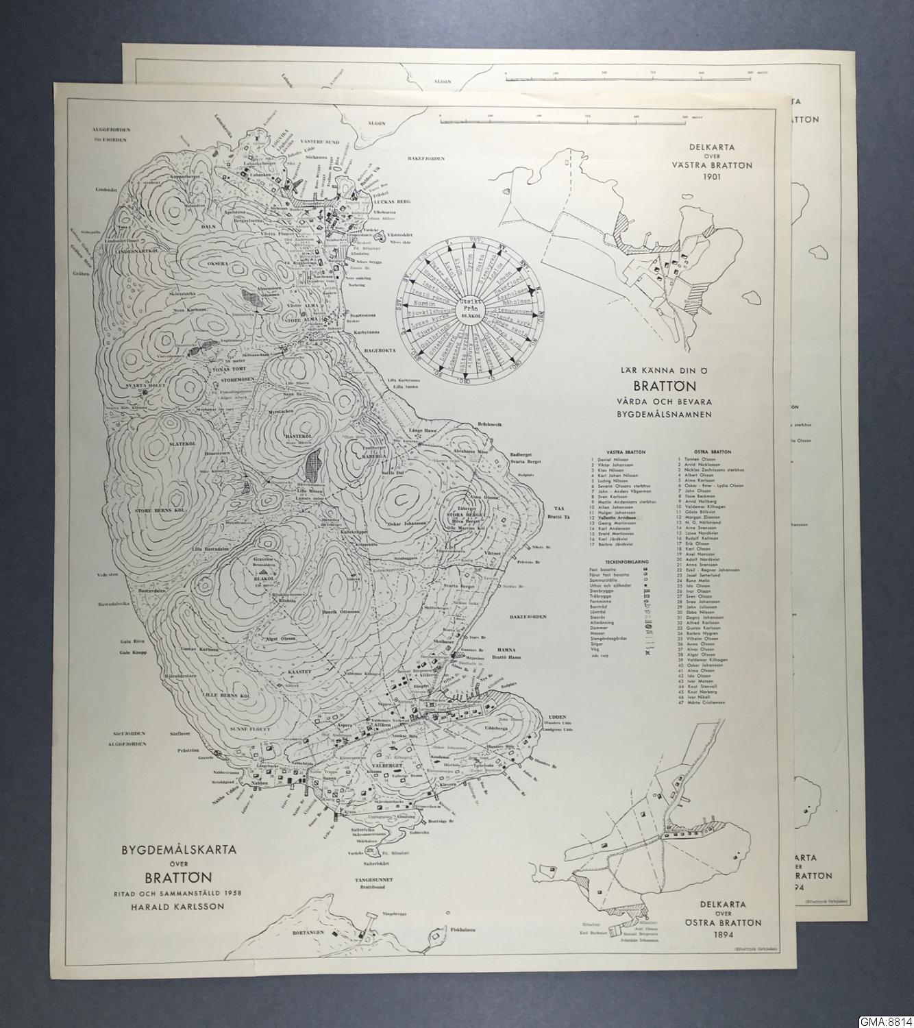 - bygdemålskarta över Brattön, ritad och sammanställd 1958 av Harald Karlsson. 2 ex.