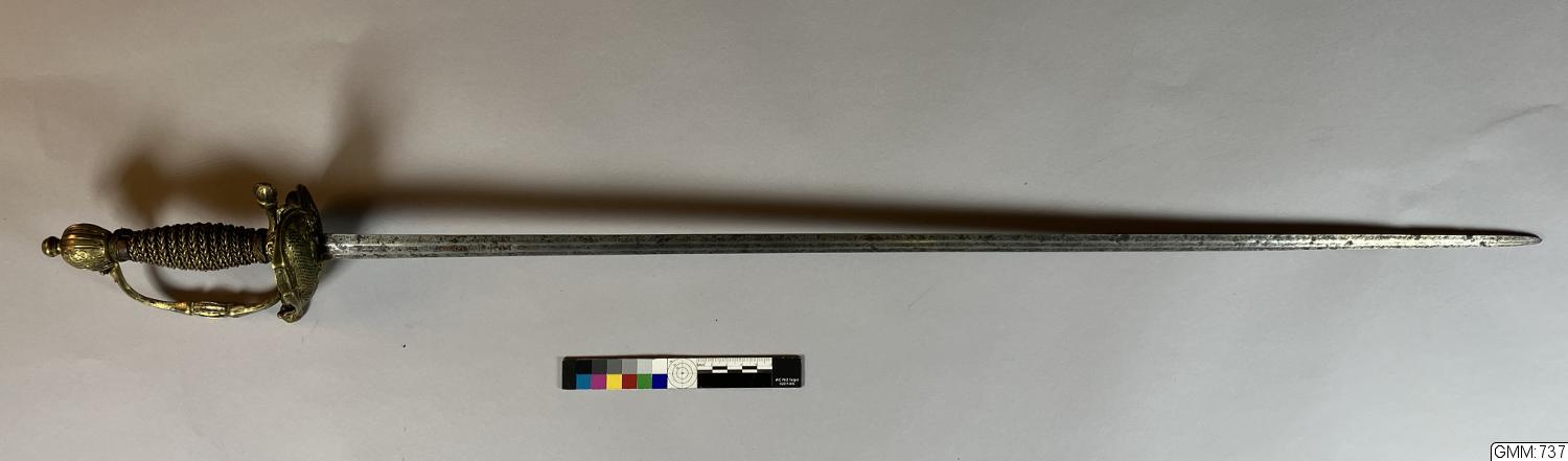 - officersvärja. Fäste med Adolf Fredriks krönta namnchiffer. Klingan spansk, etsad och märkt MADRIT