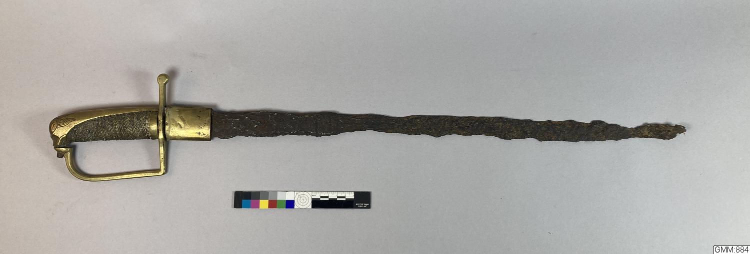 - enkelt bygelfäste av mässing. Hårt förrostad klinga. Baljans munbleck kvarsittande.