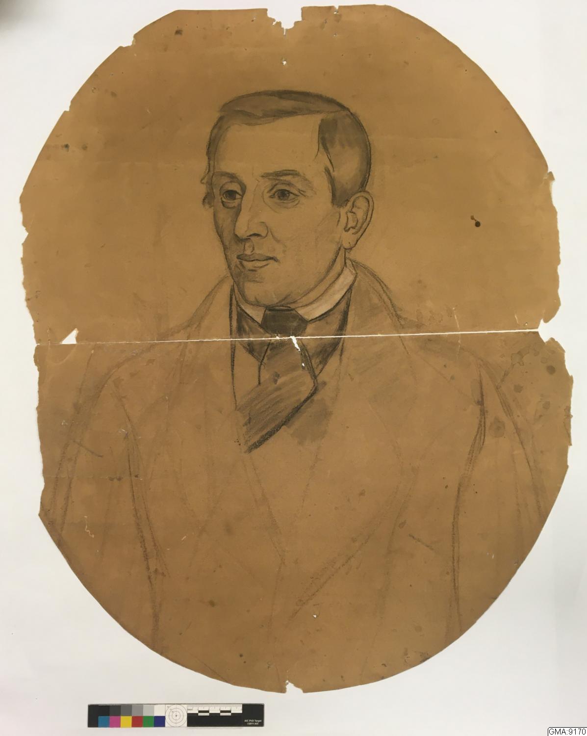 teckning i svartkrita, oval 65 x 54 cm: arbetsskiss (bröstbild) till oljemålning föreställande Nathan Gumpert (1805 54 bokhandlare i Göteborg). Av Geskel Saloman, 1851.