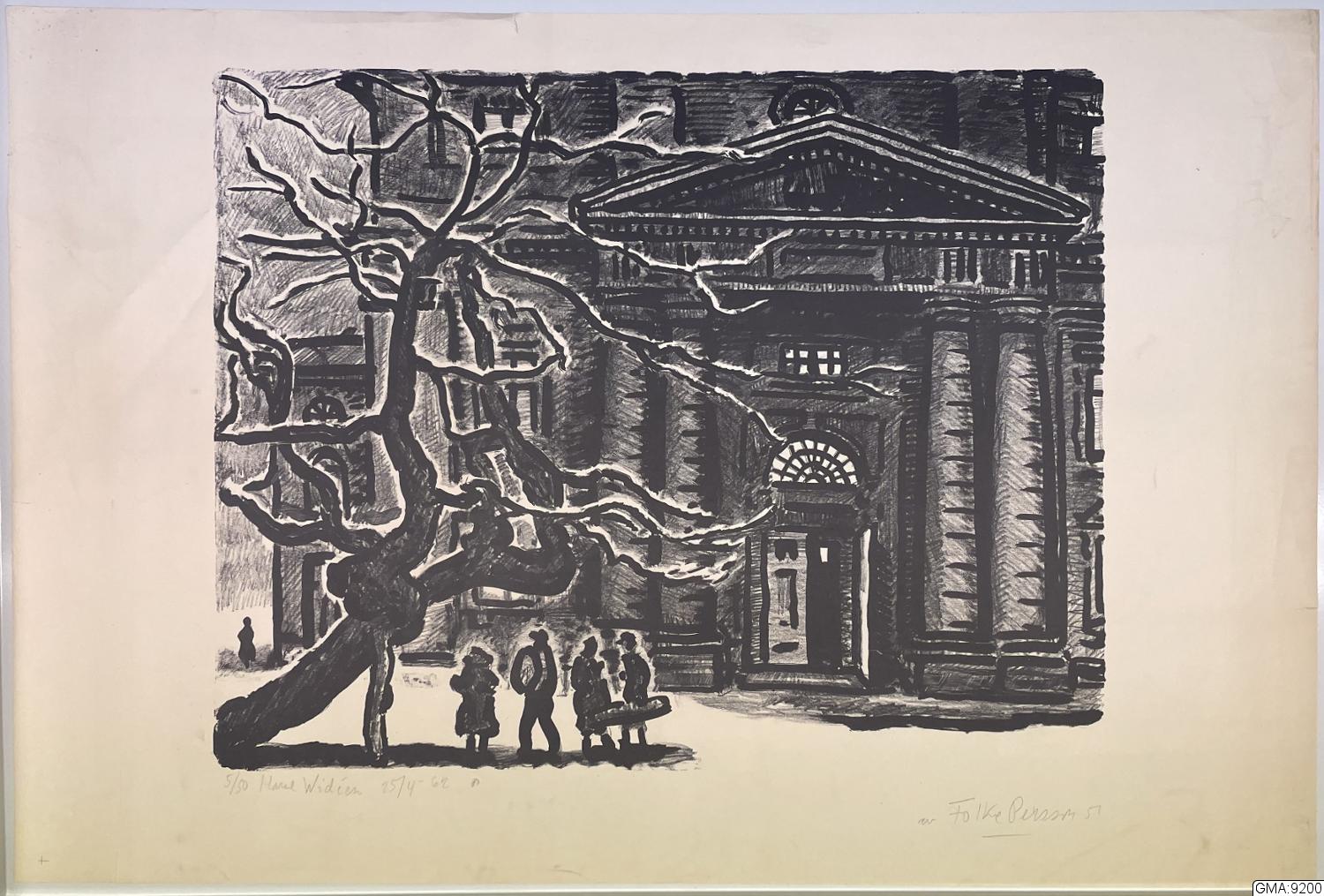 - litografi av Folke Persson 1951: Domkyrkoplan och Domkyrkans huvudportal, vinter. "5/50. Harald Wideen 25/4 -62." Bladets ytterkanter: 62 x 90 cm.