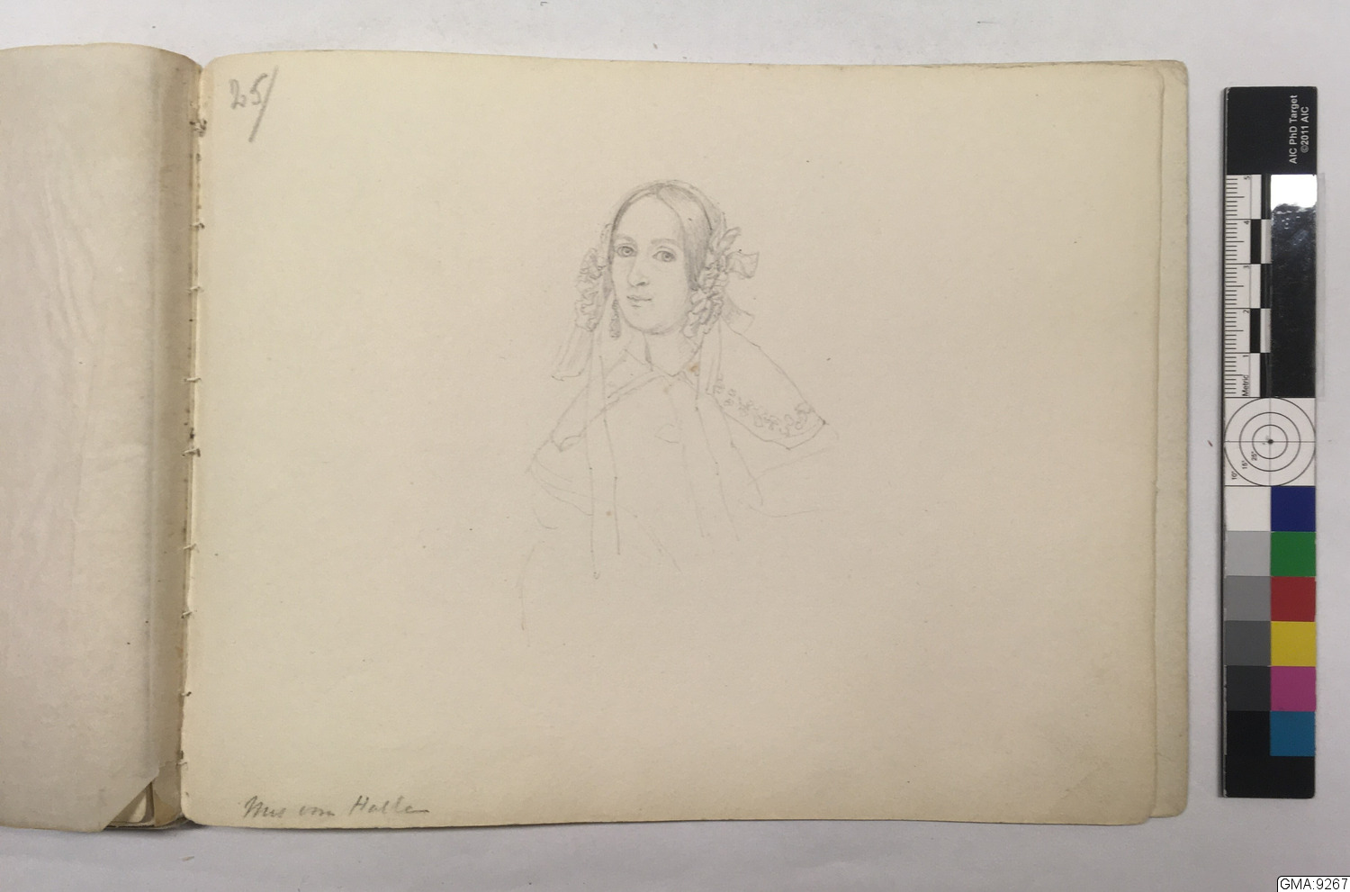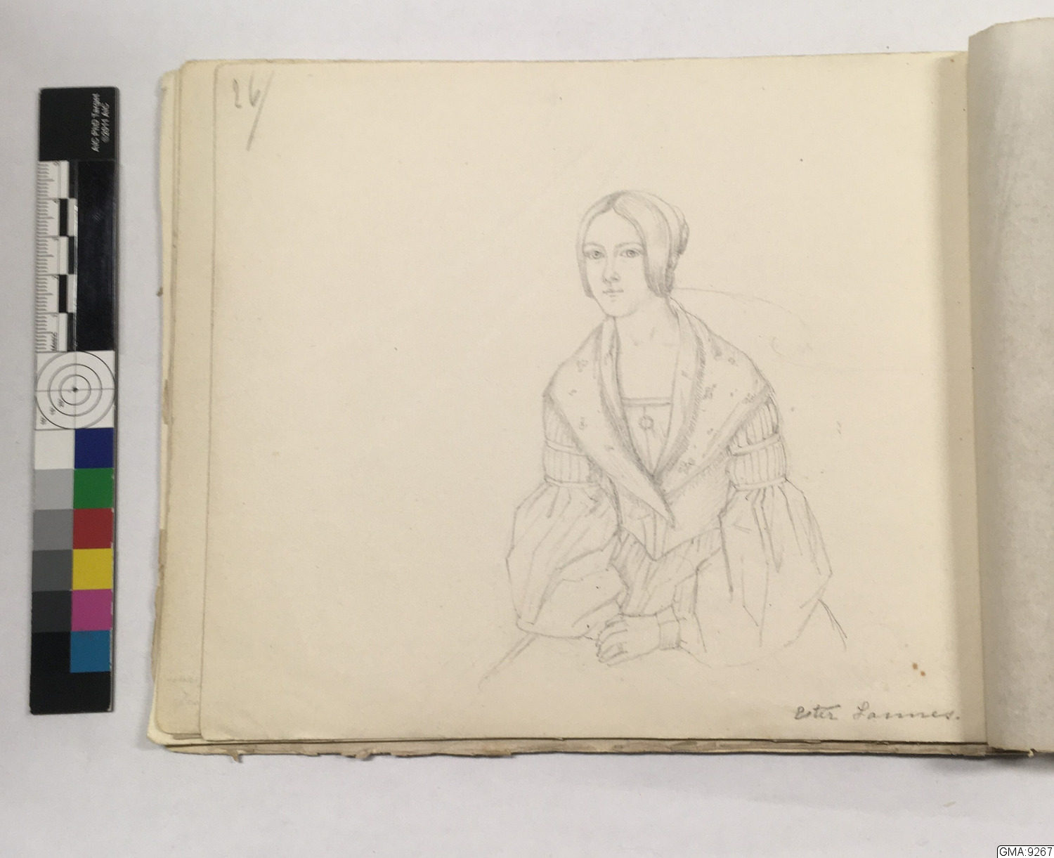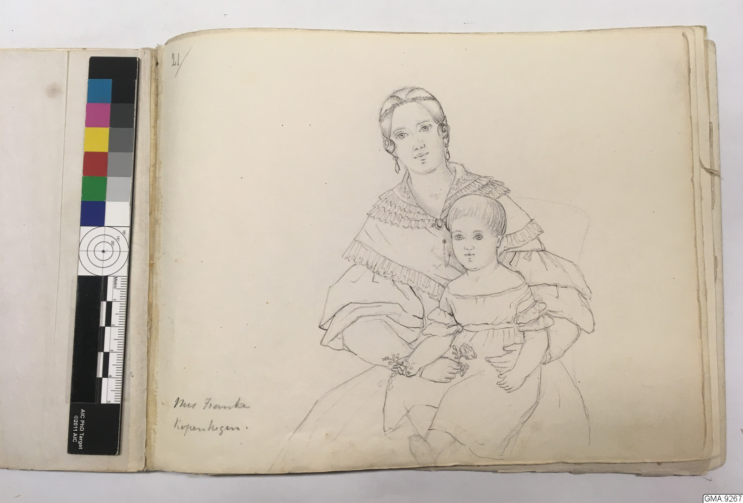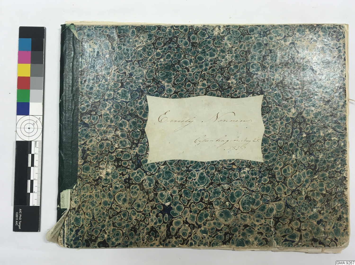 - skissbok, tvär 8:o (17 x 22 cm). På främre pärmen etikett med text i bläck: "Emily Nonnen / Copenhagen Aug.25 1839." (Emily N. f. 1812, d. 1905.) Innehåller personporträtt i blyerts av E. N.