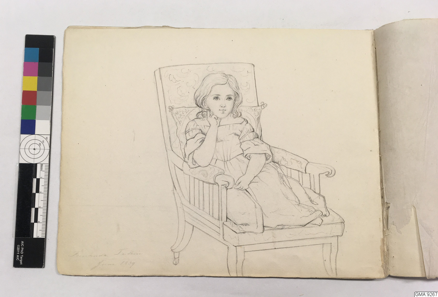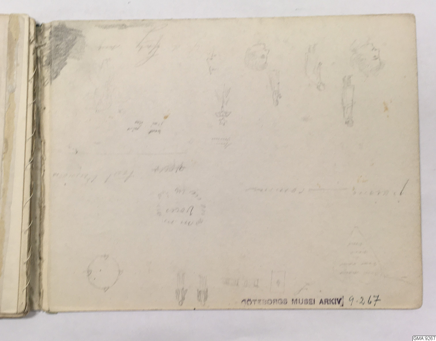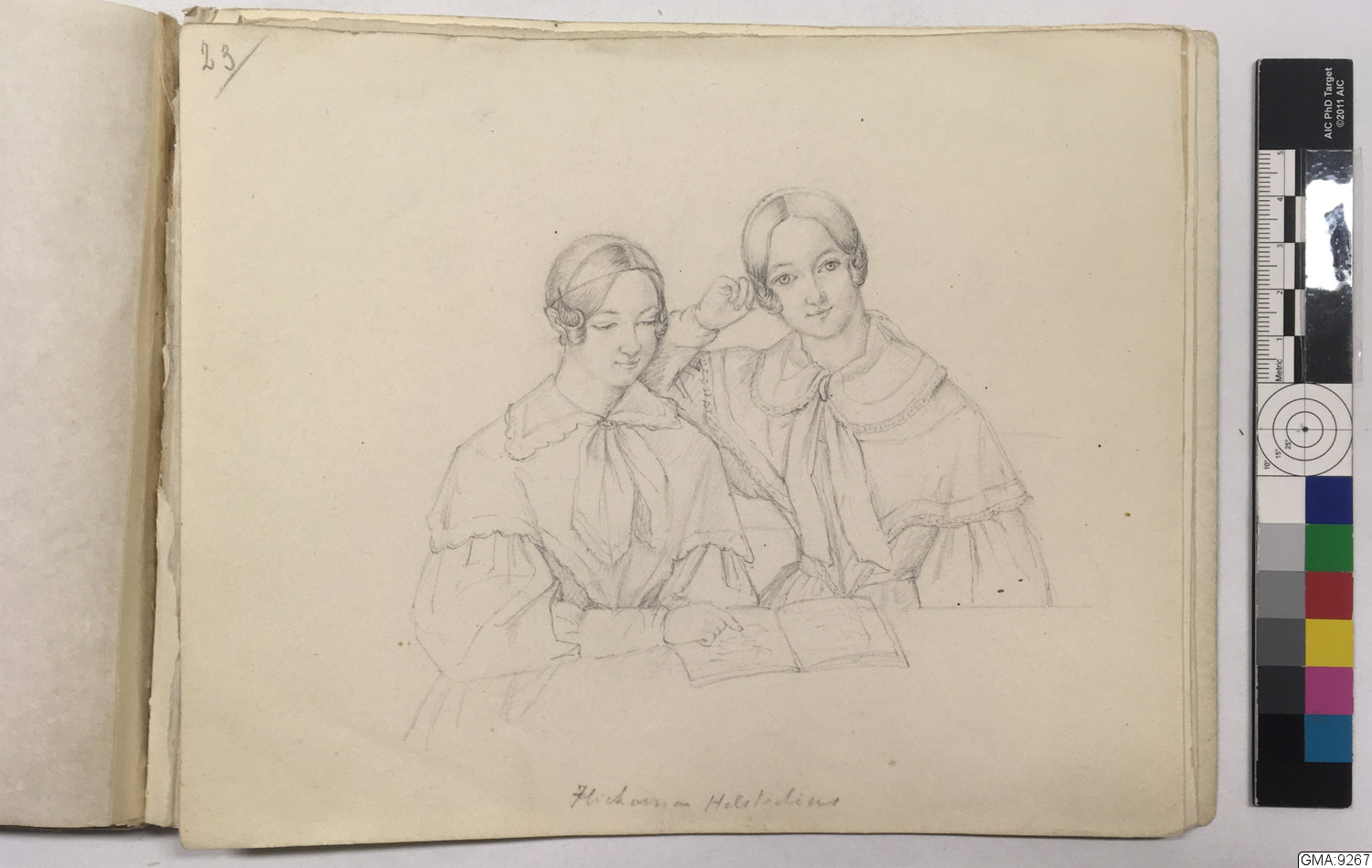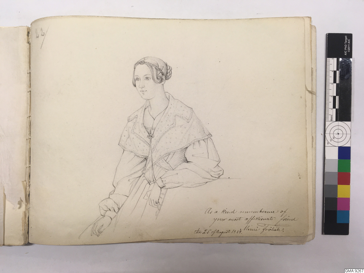 - skissbok, tvär 8:o (17 x 22 cm). På främre pärmen etikett med text i bläck: "Emily Nonnen / Copenhagen Aug.25 1839." (Emily N. f. 1812, d. 1905.) Innehåller personporträtt i blyerts av E. N.